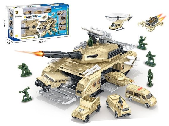 Baza wojskowa w czołgu, pojazdy, żołnierze; 46,5x23,5x11cm, W/B