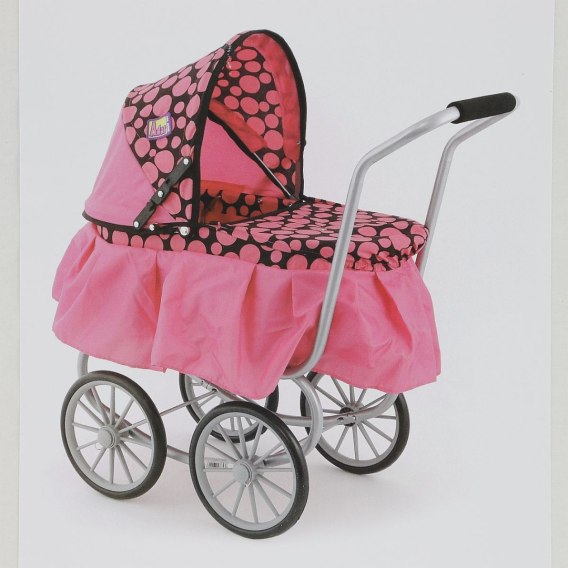 Wózek głęboki dla lalek, falbanką (ciemnoróżowy z czarnym, w duże koła), wys. 67cm; 53x34x14cm Box