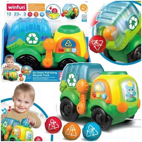 ŚMIECIARKA DO CIĄGNIĘCIA EDUKACYJNA INTERAKTYWNA MELODIE NAUKA EKO WINFUN ▶️ Kolorowa, interaktywna śmieciarka marki Winfun to doskonała propozycja dla dzieci już od 12 miesiąca życia. Zabawka uczy poprzez zabawę - maluch poznaje podstawy ekologii i sortowania odpadów, rozwijając przy tym zdolności manualne i motoryczne. ✅ Funkcje i cechy: Pojazd do ciągnięcia na sznurku - podskakujące kulki podczas jazdy. 3 kolorowe piłeczki do recyklingu - wrzucane przez otwór na górze śmieciarki. Dźwignia wyrzucająca kulki - nauka zasady przyczyna-skutek. Panel z przyciskami aktywującymi ponad 15 dźwięków i melodii. Ikony koszy i przycisk recyklingu - nauka segregacji odpadów. Efekty świetlne i dźwiękowe przyciągające uwagę dziecka. ✅ Rozwija: Umiejętności manualne i motoryczne. Logiczne myślenie i rozumienie zależności. Podstawy ekologii - segregacja i recykling. Koordynację ruchową i zdolność ciągnięcia zabawki. Reakcje emocjonalne dzięki pozytywnym dźwiękom i światełkom. ▶️ Interaktywna śmieciarka Winfun to świetny pomysł na prezent, który nie tylko bawi, ale również uczy - zachęcając do ekologicznego myślenia od najmłodszych lat. Wiek - 12m+ Wymagane baterie - 2 x AAA (baterie testowe w zestawie) Wymiary opakowania - 26 x 21 x 14 cm Kod producenta - 250302 Producent - Winfun
