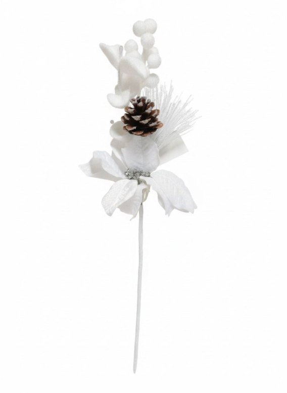 Zimowa gałązka na druciku w kolorze białym z kwiatem gwiazdy betlejemskiej oraz elementami dekoracyjnymi o długości 49 cm to idealna ozdoba, która doda świątecznego blasku każdej aranżacji. Dzięki swojej elegancji i wszechstronności, stanowi doskonały dodatek do świątecznych dekoracji, wprowadzając zimową atmosferę.