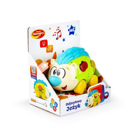 i jabłuszka, które po naciśnięciu świecą, a także aktywują melodie oraz edukacyjne piosenki. Na drugim boku jeżyka znajduje się motylek, który podczas przesuwania zabawnie terkocze. Zwierzak wyposażony został w praktyczny przełącznik ON/OFF, umożliwiający wyłączenie jeżyka po zakończonej zabawie.