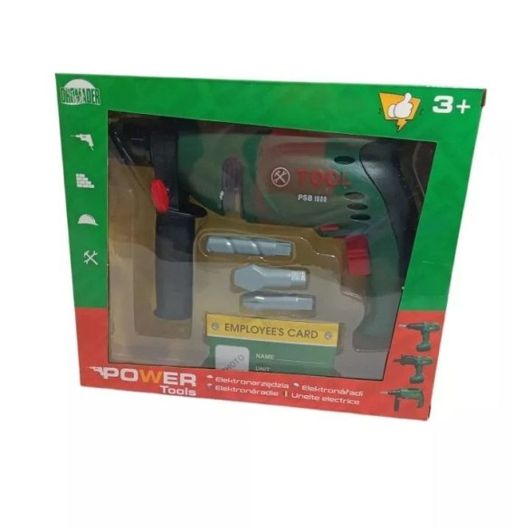 - bezpieczna imitacja prawdziwej wiertarki z ruchomymi elementami do zabawy dla dzieci,