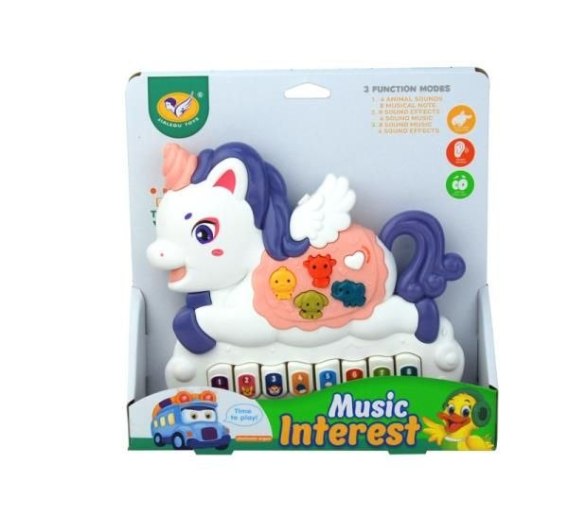 Pianinko w kształcie jednorożca to interaktywna i edukacyjna zabawka przeznaczona dla dzieci od 12 miesiąca życia. Kolorowe pianinko zostało wyposażone w trzynaście przycisków (w tym cztery przyciski w kształcie zwierzątek), które po naciśnięciu aktywują różne wesołe dźwięki, co z pewnością przyciągnie uwagę najmłodszych i zachęci do wspaniałej zabawy. Produkt posiada funkcję try-me. Zabawka pozytywnie wpływa na prawidłowy rozwój dziecka przez stymulację zmysłu wzroku, słuchu i dotyku, co jest kluczowe w procesie uczenia się i poznawania otaczającego świata. Zabawa pianinkiem w kształcie jednorożca zapewni dziecku mnóstwo radości i rozrywki. Produkt jest zapakowany na blistrze. Baterie: 2xAAA 1,5V (dołączono) Wymiary opakowania: 22x4,5x23cm Wiek: 12m+