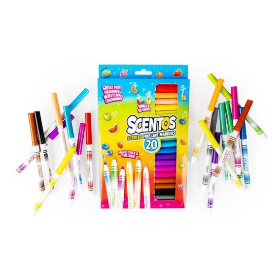 Ten zestaw pachnących flamastrów bez trudu zastąpi dwa rodzaje mazaków! Wszystko za sprawą końcówki, która umożliwia rysowanie zarówno grubej, jak i cienkiej, precyzyjnej linii. Zestaw zawiera aż dwadzieścia flamastrów, różniących się kolorem i zapachem. Produkt przeznaczony jest dla dzieci od 3 roku życia. Cechy produktu: - w zestawie 20 flamastrów w różnych kolorach; - każdy z flamastrów pachnie inaczej; - flamastry umożliwiając rysowanie cienkiej lub grubej kreski; - wiek: 3+