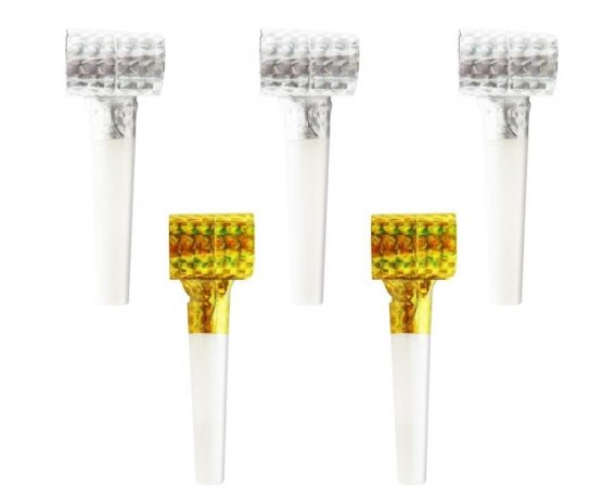 TRĄBKI GWIZDKI HOLOGRAFICZNE ZŁOTO-SREBRNE Długość: 25 cm Kolor: złoty, srebrny Materiał: plastik, folia Ilość sztuk w opakowaniu: 5 szt. Producent: Godan S.A.
