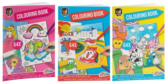 Dostępna jest w 3x wariantach (Różowym, niebieskim i żółtym) - Różowa kolorowanka, zawiera księżniczki i jednorożce - Niebieska kolorowanka zawiera samochody i inne pojazdy - Żółtka kolorowanka zawiera zwierzątka