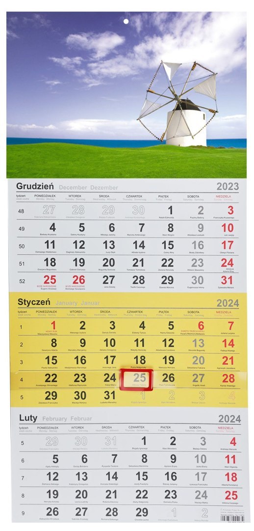 Format: 288mm x 622mm układ kalendarium: 1 kartka - 3 miesiące ilość stron: 12 kartek druk: 2 kolory rodzaj papieru: offset 80g/m2 biały rodzaj: trójdzielny