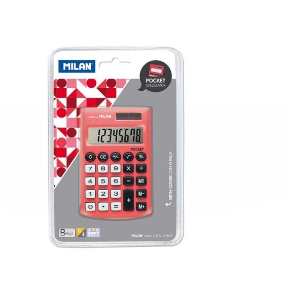Kalkulator 8-pozycyjny z miękkimi gumowymi klawiszami w zamykanym etui. 3 klawisze pamięci. Klawisz zmiany znaku +/-. Pierwiastek kwadratowy. Podwójne zasilanie: bateria 1,5V oraz bateria słoneczna. Automatyczne wyłączanie. Kalkulatory MILAN spełniają wymagania dyrektywy RoHS o ograniczeniach stosowania niektórych substancji niebezpiecznych w urządzenia elektrycznych i elektronicznych. Pakowany na blistrze. Rozmiar kalkulatora: 9,7 x 6,2 x 0,8 cm.