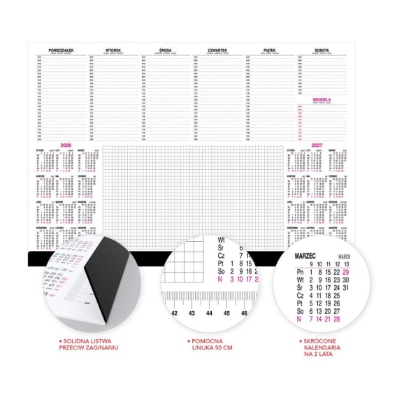 U dołu każdej strony znajduje się duże pole w kratkę na notatki oraz kalendaria roczne na lata 2026 i 2027, co pozwala mieć pełen obraz planów krótko- i długoterminowych. Całość zaprojektowano z myślą o maksymalnej wygodzie użytkownika.