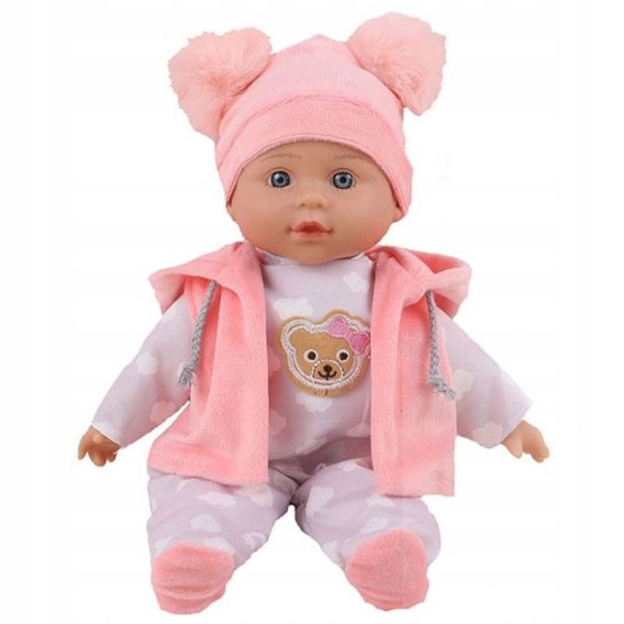 LALKA BOBAS Julka 32cm MÓWI PO POLSKU I PO ANGIELSKU Lalka Julka uczy dzieci opiekuńczości i wrażliwości, można zabrać ją ze sobą na spacery. Miękka lalka jest ubrana w piękną, mieciutką welurową czapeczkę, z puchatymi pomponikami w kolorze moreli , śpioszki w białe chmurki z aplikacją misia oraz ciepły, welurowy bezrękawnik z kapturem w kolorze czapeczki. Lalka, po naciśnięciu na brzuszek: Mówi po polsku i po angielsku ponad 60 słów w każdym języku Śpiewa 3 piosenki Opowiada 2 bajki: o "Złotowłosej i 3 misiach i Czerwonym Kapturku"Noszenie, kołysanie, przytulanie lalki przynosi wiele pozytywnych emocji i pozwala na harmonijny rozwój. Poprzez zabawę pobudza rozwój systemów sensorycznych. Wysokość lalki 32 cm