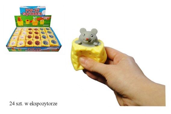 Zabawka gniotek w kształcie kostki sera. Po ściśnięciu ukazuje się zwierzątko (myszka). Produkt występuje w kilku wersjach kolorstycnych, wybierany losowo. Cena dotyczy jednej sztuki. Produkt zapakowany w przezroczysty worek.