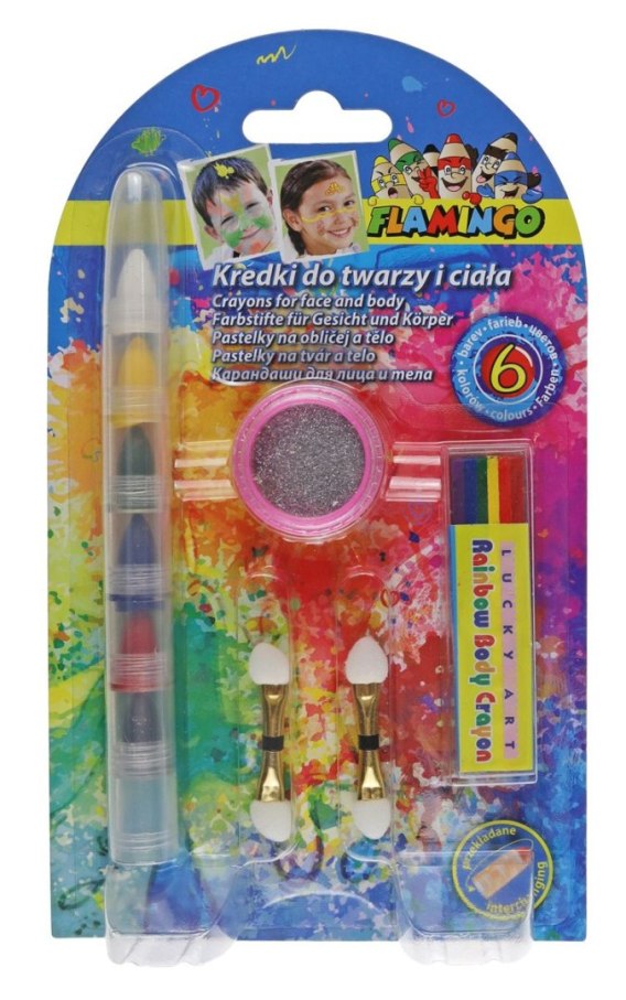 Zestaw 6 przekładanych kredek przeznaczonych do makijażu twarzy i ciała. Łatwe w użyciu i przechowywaniu. Plastikowa obudowa chroni dłonie przed zabrudzeniem i umożliwia zachowanie czystości w miejscu pracy. Bezpieczne - nie podrażniają skóry. Przed przystąpieniem do malowania: 1. Wypróbuj farby na wewnętrznej stronie ręki (upewnij się, że nie masz alergii na którykolwiek ze składników). 2. Zepnij włosy lub nałóż opaskę tak, aby włosy nie przeszkadzały Ci w pracy. 3. Twoja skóra powinna być czysta i sucha. 4. Zaplanuj malowanie motywów pamiętając, że nakładanie kolejnych farb zmieni ich barwę. 5. Nie nakładaj kredek na skaleczone lub podrażnione miejsca. 6. Ostrożnie nakładaj kredki w okolicach oczu, tak by siędo nich nie dostały. Usuwanie: Kredki usuwaj z ciała kosmetykami do demakijażu.
