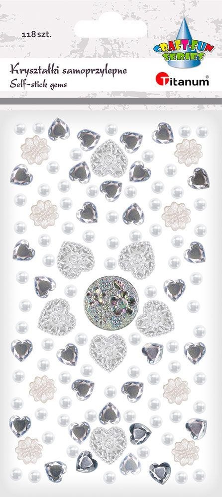Kryształki samoprzylepne, mix wzorów, kolor: białe, wzory: serca 17 x 17 mm, kwiatki średnica 13mm, perełki średnica 6mm, lustrzane serca 10x10mm. 118 sztuk.