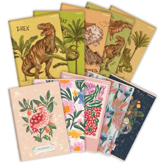 Kolekcja zeszytów inspirowana światem dinozaurów i domowymi kwiatami - łączy w sobie 2 zupełnie różne style ilustracji. 5 okładek przedstawia ryciny z wizerunkami i nazwami dinozaurów na tle elementów natury. Kolejne 5 to abstrakcyjne kwiaty w postaci wzorów lub umieszczone w wazonach. Wszystkie ilustracje zostały indywidualnie zaprojektowane, dzięki czemu są niepowtarzalne i jedyne w swoim rodzaju. Znajdź swoją ulubioną okładkę z kolekcji Dino Spring i wyróżnij się w klasie!