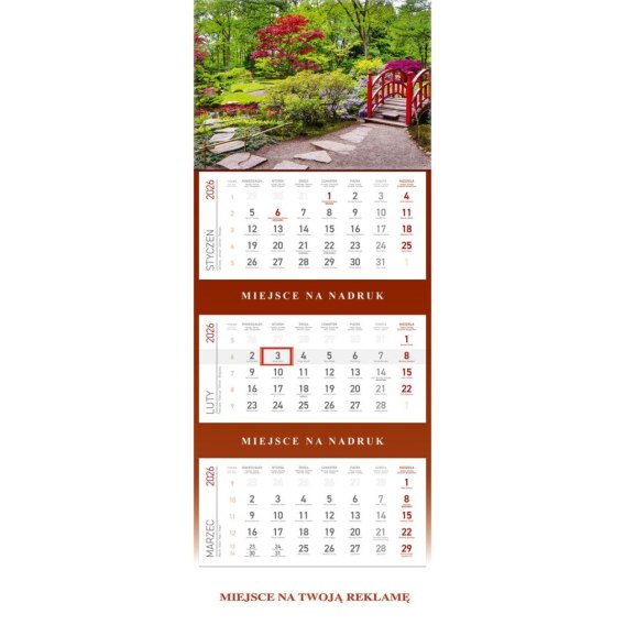 Kalendarz trójdzielny •nr katalogowy: 1255 •układ: trzymiesięczny •format główki: 295 x 210 mm •format kalendarza: 850 x 295 mm •format kalendarium: 280 x 135 mm •obszar nadruku: 2 x 280x40 mm; 1 x 280x80 mm •opakowanie zbiorcze: 10 szt.